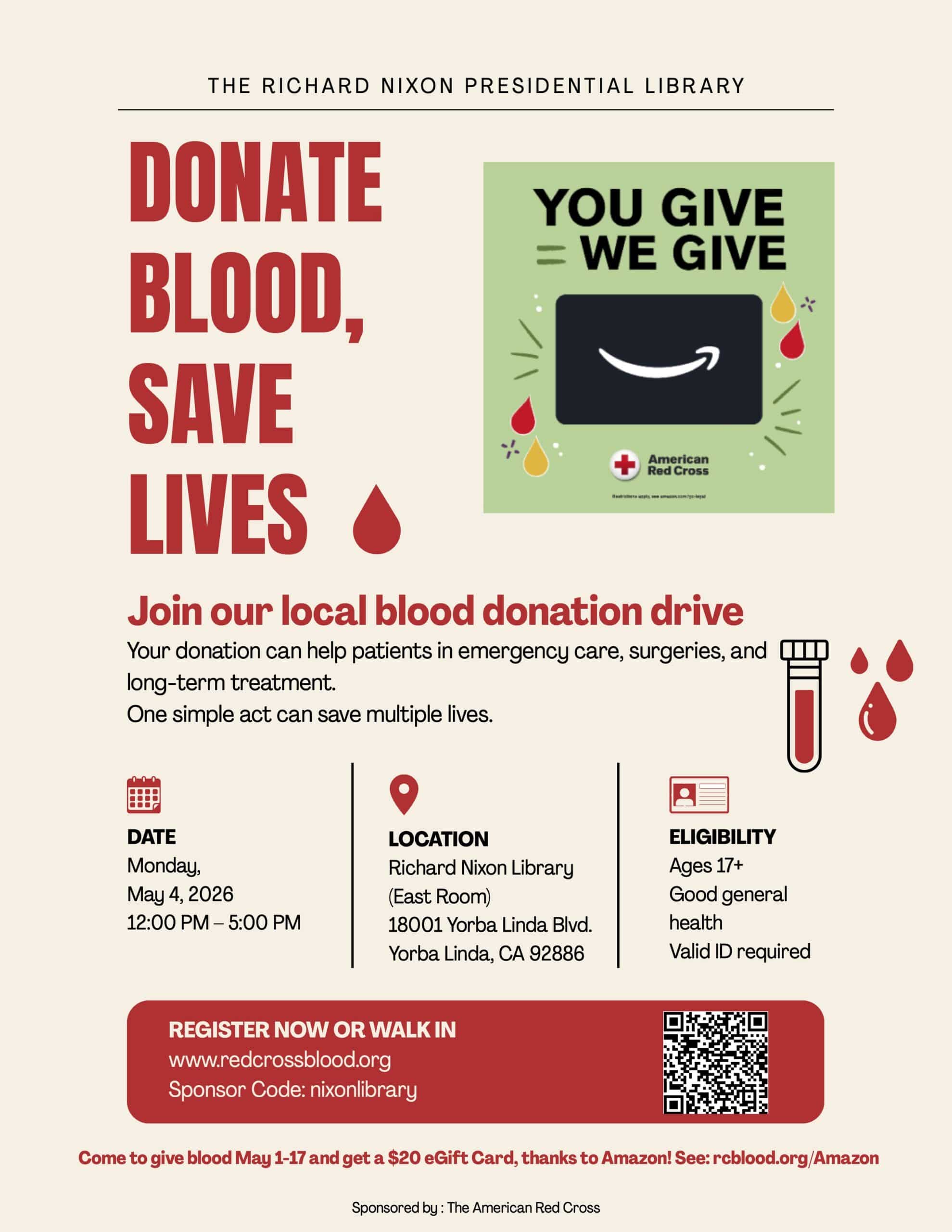 The Richard Nixon Foundation intends to continue these popular and meaningful blood drives as long as the shortage continues.